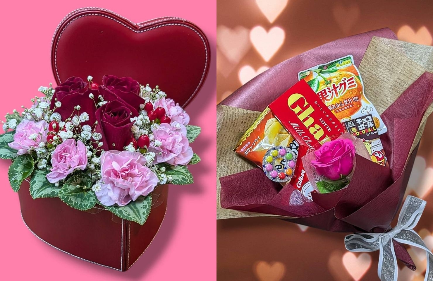 バレンタイン商品ではソープフラワー入りのお菓子ブーケは他では見ない一品。