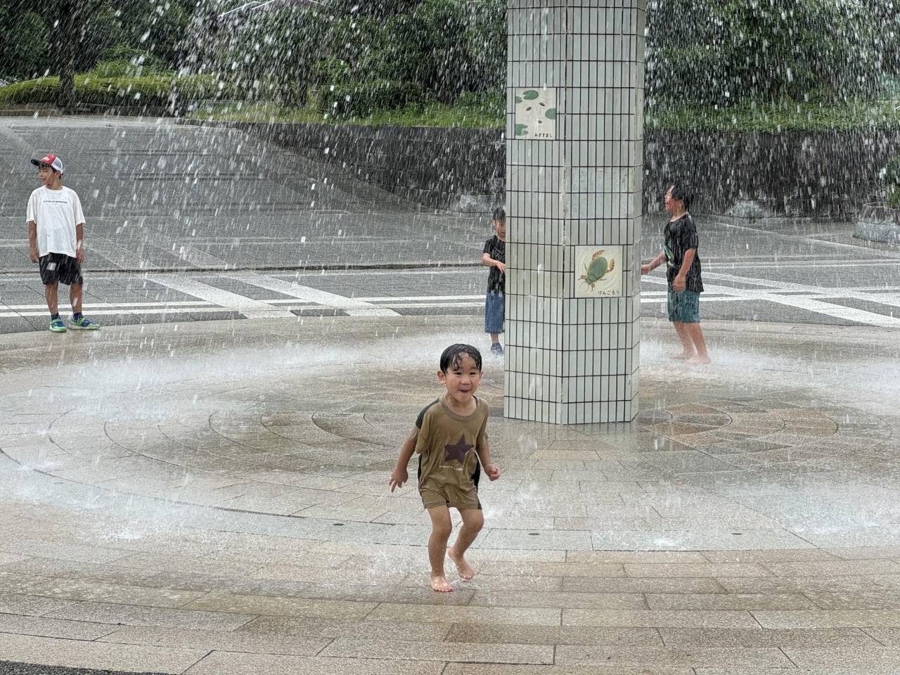 広々とした広場の真ん中に、夏にうれしい噴水のシャワー!