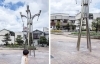 お水がたまるとひっくり返るバケツがオブジェの頭頂部に4つあって、うまくヒットすると、キッズがびっしょびしょになってくれます!
