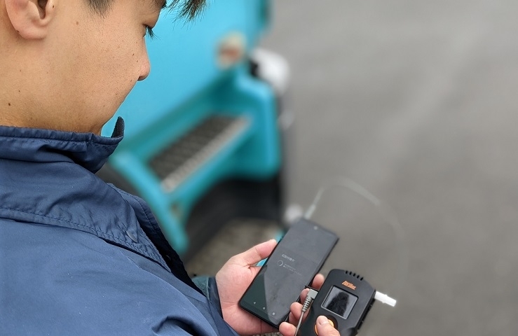 金栄丸港運さんでは、ドライバーさん一人ひとりに、アルコールチェッカー機器とスマートフォンを連携させた「アルキラーPlus」を導入済みです。
